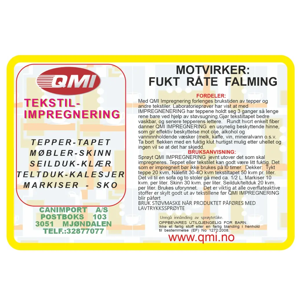 Med QMI Impregnering forlenges brukstiden av markiser, tepper og andre tekstiler. Laboratorieprøver har vist at med QMI IMPREGNENERING, har teppene holdt seg 3 ganger så lenge rene, bare ved hjelp av støvsuging. Gjør tekstiltapet bedre vaskbar, og senere tekstil rens lettere. Rundt hvert enkelt fiber danner QMI IMPREGNERING en usynlig beskyttende hinne, som er effektiv mot olje, alkohol og vanninnholdene væsker (melk, kaffe, vin, mineralvann osv. Ta bort flekken med en fuktig klut hurtigst mulig etter uhellet og ingen vil se at det har skjedd. Gjør at markiser og kalesjer holder seg renere og motstår fukt, mugg og råte.